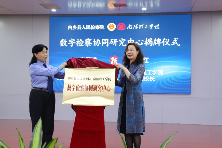 本网讯(特约记者/温嘉)7月6日上午,我校南阳大数据研究院与内乡县人民检察院检校合作暨数字检察协同研究中心揭牌仪式在内乡县人民检察院成功举办。南阳市人民检察院党组副书记、常务副检察长宋景婵,中共内乡县委副书记、县长孙红鑫和市、县领导出席揭牌仪式,我校副校长张爱红受邀出席该活动,该活动由中共内乡县委常委、政法委书记徐成旺主持,宋景婵、张爱红、孙红鑫等分别发表讲话。内乡县政法单位、大数据局负责人、县直有关部门负责人、检察院中层以上干警和我校南阳大数据研究院、传媒学院相关人员参加了揭牌仪式。