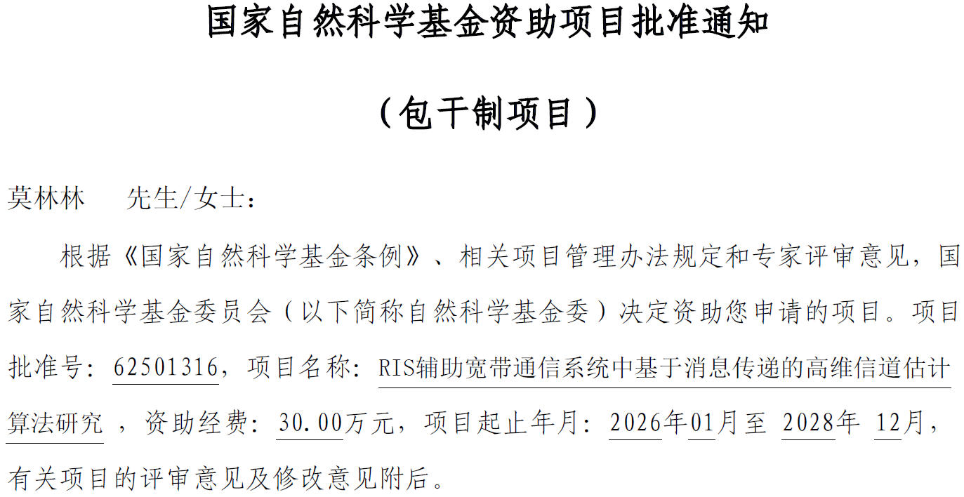 本网讯(特约记者/路新华) 8月27日,国家自然科学基金委员会发布了《关于2025年国家自然科学基金集中接收申请项目评审结果的通告》。电子信息学科研究院通信信号处理研究所青年教师莫林林博士申报的《RIS辅助宽带通信系统中基于消息传递的高维信道估计算法研究》项目喜获青年科学基金项目(C类)[原青年科学基金项目]资助,直接经费30万元。此次获批是我院在国家级项目培育与基础研究人才队伍建设方面取得的又一重要成果。