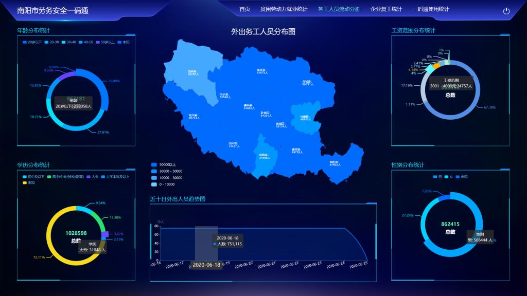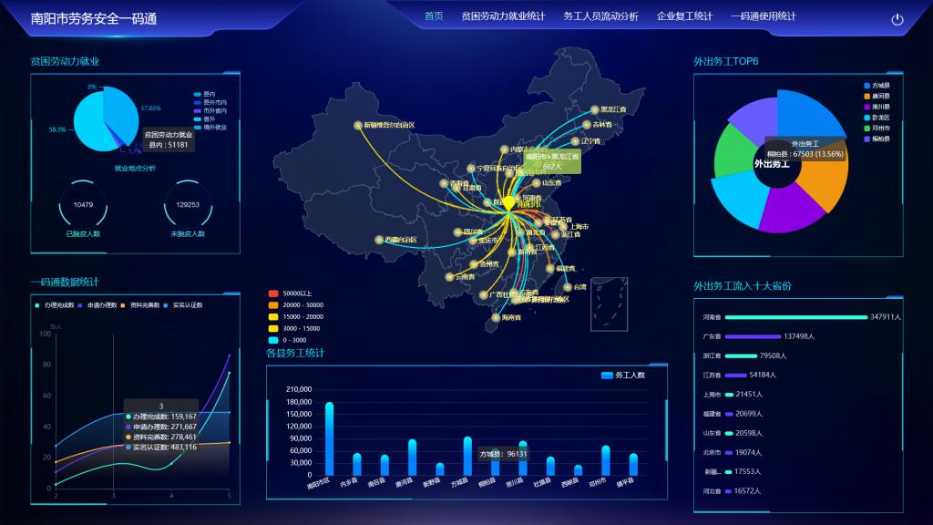 2020年,为了在做好疫情防控工作的同时,推进针对富余劳动力外出务工及我市企业节后复工,有组织地进行外出前健康状况核查检测、有组织地开展劳务输出、有组织地开工复工和信息可追溯,南阳理工学院承担了“南阳市劳务安全一码通平台”的开发。该平台将“三有一可”工作机制贯穿新冠肺炎疫情防控中,实现外出务工人员健康监测、电子健康码的申请和审批、企业复工复产用工需求,以及信息的追踪溯源。该系统的应用是我市在疫情影响较重形势下打好疫情阻击战,做好复工复产的有效途径。