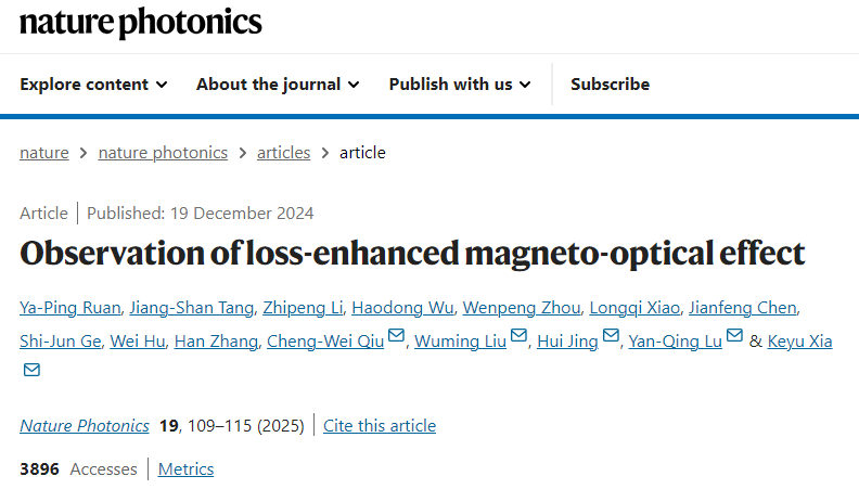 (摘自Y.-P. Ruan, J.-S. Tang, Z. Li et al. Observation of loss-enhanced magneto-optical effect. Nat. Photon. 19, 109–115 (2025).)