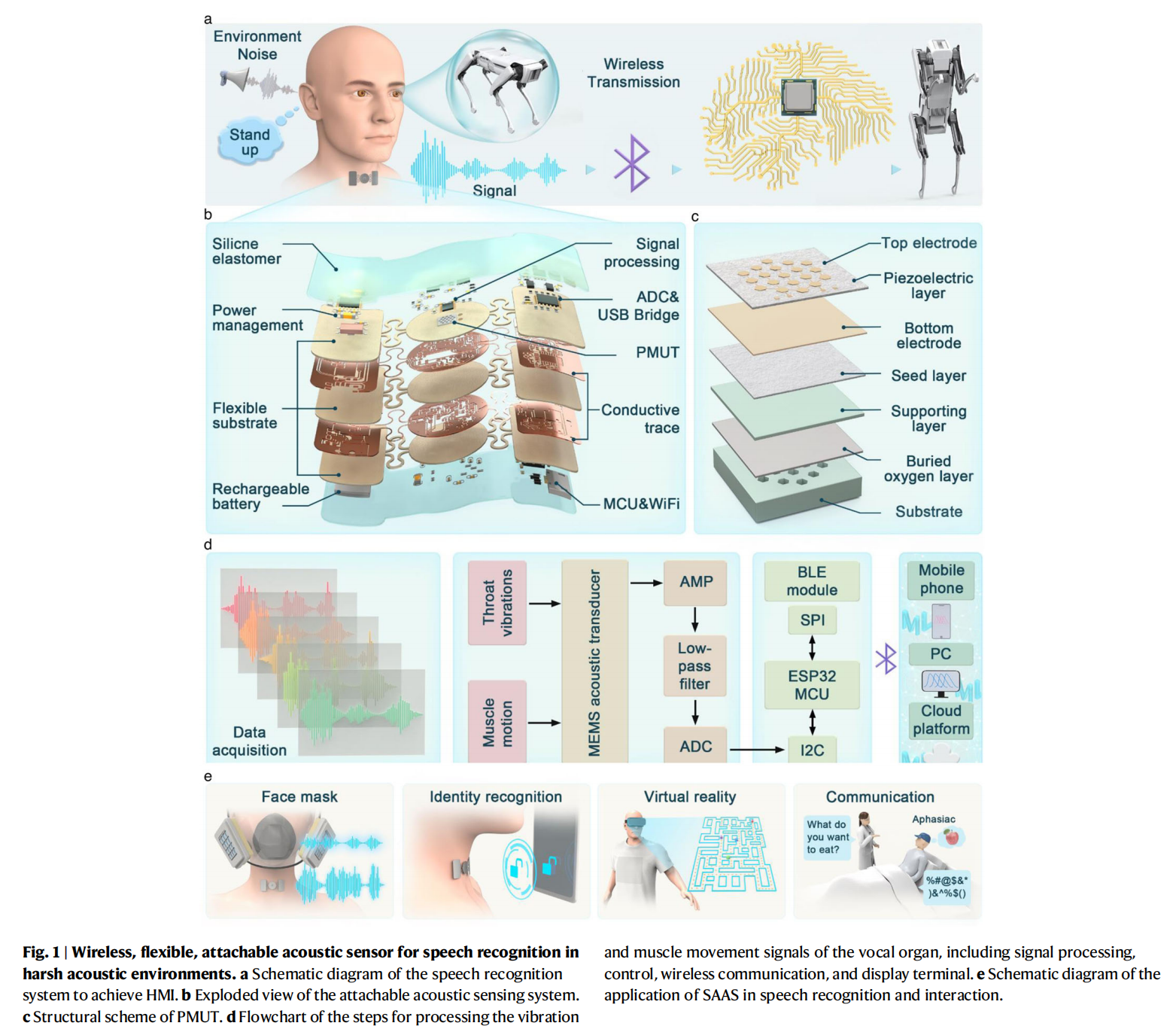语音识别作为最自然的人机交流方式,然而传统语音识别系统依赖于远场麦克风阵列,在嘈杂环境、口罩遮挡和个性化声学特征提取方面存在诸多局限,尤其在高噪声环境(如工业现场、户外)中表现不佳。该项研究通过高灵敏度声学传感器设计,柔性封装与皮肤贴附技术,并集成了深度学习算法,提升语音识别准确率。本研究不仅实现了高灵敏度语音检测,还通过无线蓝牙模块支持实时数据传输,使设备具备多样化应用包括语音控制、声纹身份认证和发声障碍患者语音重建等功能。
