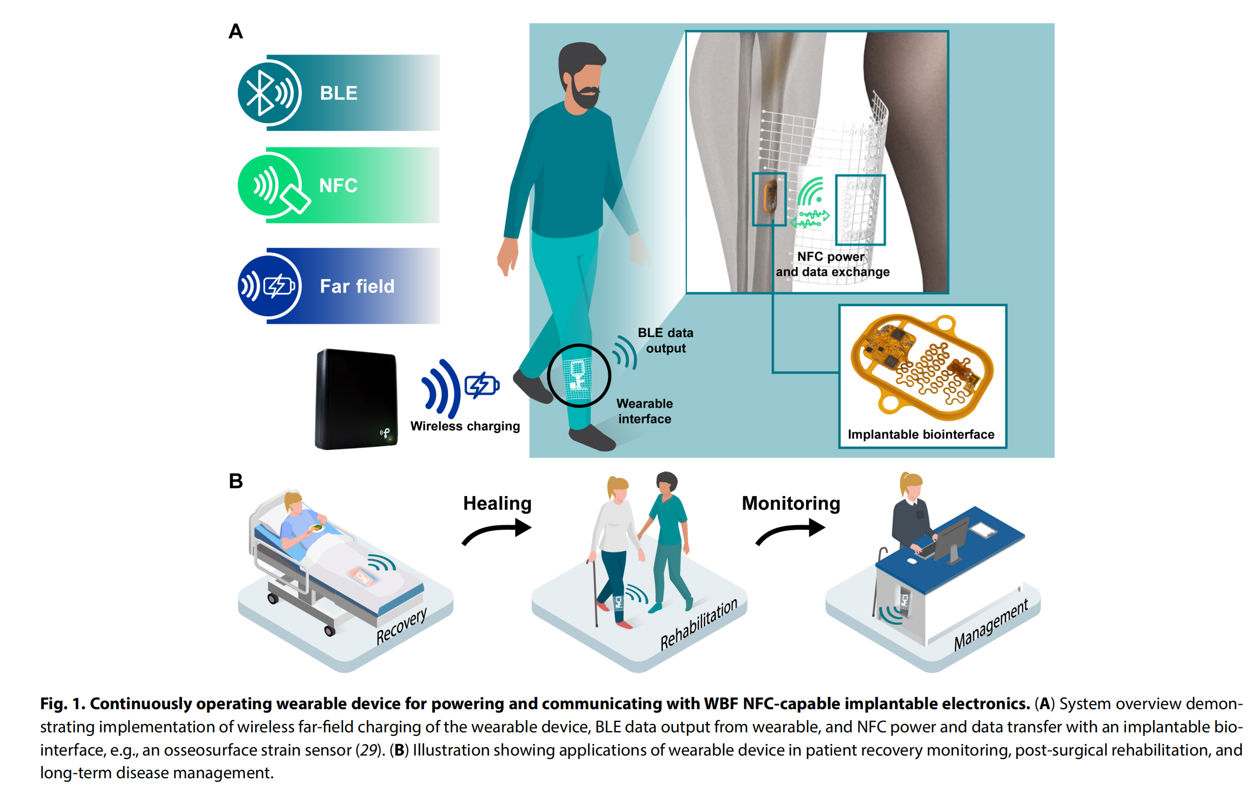 这项创新的核心在于一个巧妙的两部分系统,它避免了在植入物内部安装电池的需求。第一个组成部分是一种柔性的可穿戴设备,被称为“生物共生枢纽”(Biosymbiotic Hub, BH),就像一个嵌有电子元件的轻巧网状袖套,可以舒适地佩戴在四肢上。这个枢纽扮演着关键的中间角色,它利用近场通信 (NFC) 技术,为深层植入的传感器无线供电并与之交换数据。从植入物收集的数据,则通过低功耗蓝牙 (BLE) 由枢纽向外传输。系统的第二个组成部分是植入物本身:“骨表面电子器件”(Osseosurface Electronics),这是一种薄而柔韧的器件,用于在标准外科手术(如骨折修复)中直接植入骨骼表面,它们包含高分辨率的应变计和温度传感器,但完全没有电池。其极小的尺寸和柔韧性最大限度地减少了组织刺激,并能贴合骨骼的曲面,特殊的涂层有助于它们随时间推移与骨骼直接整合,形成长期的稳定界面。