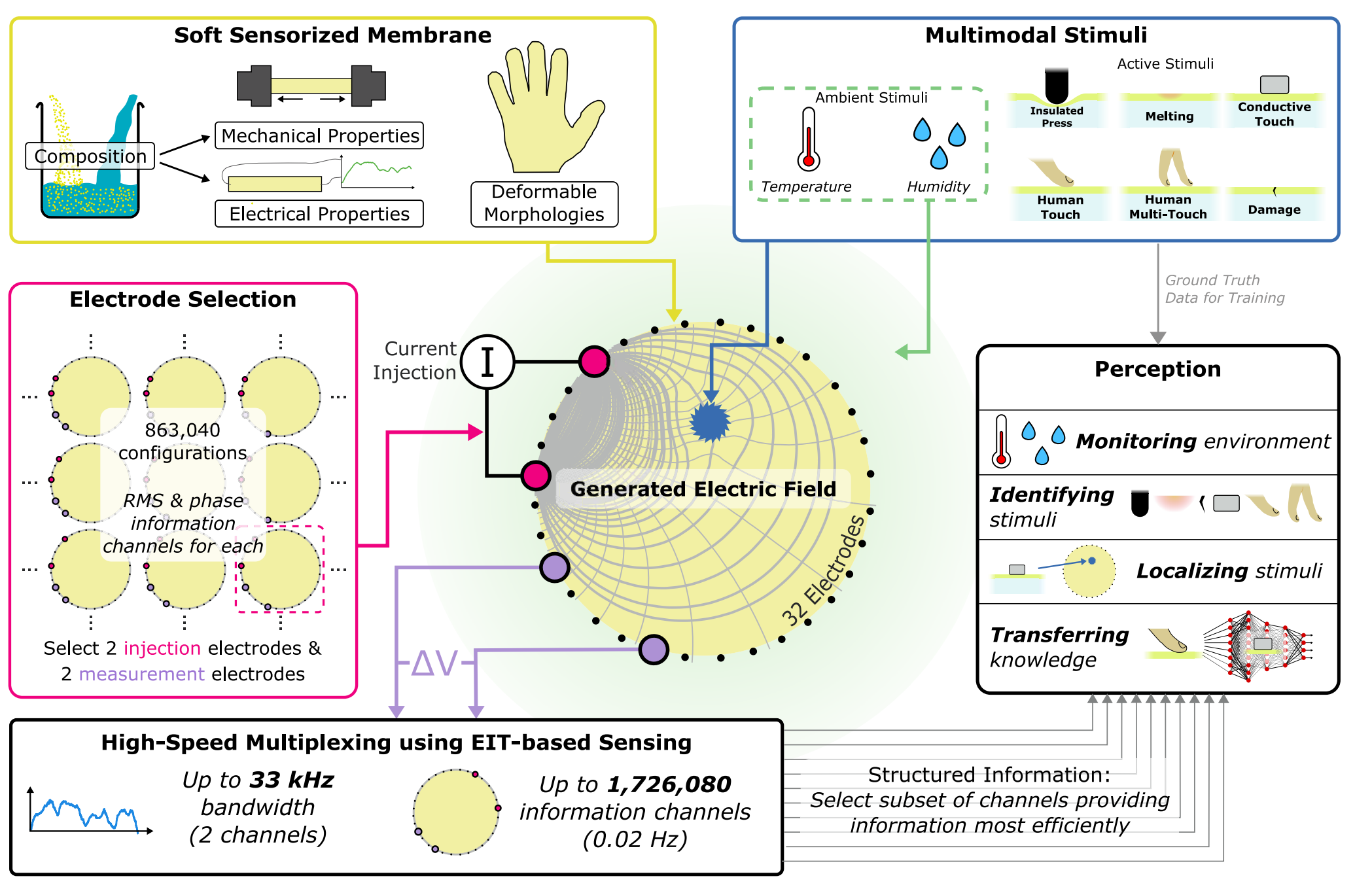 现有多模态机器人皮肤的三大问题:制造繁琐、软硬界面容易损坏、信号干扰严重。传统方法依赖于在柔性基底中嵌入多个小型传感器组件,需要在大表面上分布和连接多个小组件,不仅制造过程复杂,还限制了皮肤只能做成简单形状,由于存在多个软硬界面,这些皮肤通常无法拉伸,或者极易损坏。剑桥团队的思路完全不同,他们把整块水凝胶变成了一个连续的传感场,通过在材料周围施加交流电,在内部形成复杂的电场分布。任何外界刺激如触摸、加热、损伤等都会改变局部导电性,进而改变电场。这项研究的核心贡献在于提出了一种新的传感器设计范式:用简单材料配合智能算法,而不是不断增加硬件复杂度。这种方法不仅降低了制造难度,还通过信息冗余提高了系统鲁棒性。