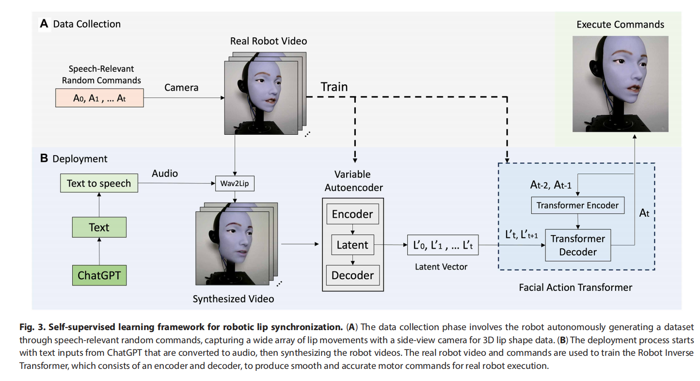 研究团队开发了具有10个自由度的软硅胶唇部驱动机制,结合变分自编码器和面部动作变换器模型,实现了无需预定义动作的实时唇音同步。研究人员还设计了一个仿人脸的人形机器人,配有柔软的硅胶皮肤和磁性连接器,使其能够在复杂的唇部动作上保持10度的自由度。实验表明,在均方误差指标上显著优于基线方法,在法语、汉语、阿拉伯语等11种语言的测试中表现出跨语言泛化能力,且支持ChatGPT生成的连续对话场景。研究还揭示了机械约束对真实机器人唇部运动的影响,提出通过数据驱动模型弥补物理限制的解决方案,为类人机器人的情感交互和多语言应用提供了技术路径。通过多个AI模型结合,可以产生逼真的唇部同步,使机器人的嘴部动作与理想视频中的不匹配性变得最小。项目技术将会推动类人机器人在教育或老年人护理方面的应用,但需防止这些技术被滥用。